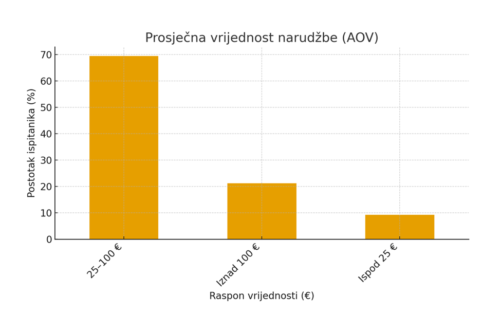 Posebno je bilo zanimljivo utvrditi kolika je prosječna vrijednost narudžbe (Average order value – AOV) u hrvatskim internetskim trgovinama. Prema rezultatima, 69,5% ispitanika navodi da se njihova prosječna vrijednost narudžbe kreće između 25 i 100 eura. Daljnjih 21,2% ostvaruje AOV viši od 100 eura, dok 9,3% posluje s prosječnom vrijednošću narudžbe manjom od 25 eura. Ovi podaci pokazuju da se većina internetskih trgovina nalazi u srednjem rasponu vrijednosti kupovine, što je tipično za opću maloprodaju i lifestyle proizvode. Manji, ali značajan udio trgovaca s višim AOV indeksom upućuje na prisutnost premium ili specijaliziranih brendova, a tek nekolicina posluje na modelu niske vrijednosti narudžbe i visokog volumena.
