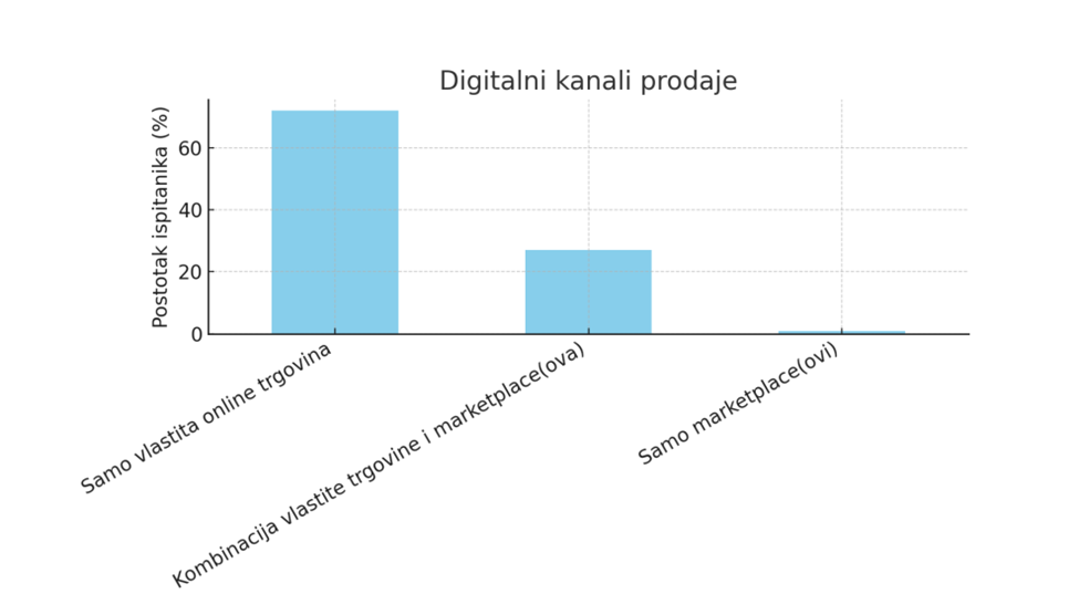 Većina online trgovina, njih 72%, prodaje svoje proizvode isključivo putem vlastite internetske trgovine, dok 27% kombinira vlastitu trgovinu s prodajom na marketplace platformama. Samo zanemariv broj trgovina, manje od 1%, u potpunosti se oslanja na prodaju putem marketplace platformi. Ovi podaci pokazuju jasnu prednost direktne prodaje potrošačima (D2C), gdje brendovi zadržavaju potpunu kontrolu nad cijenama i podacima o kupcima. Ipak, gotovo trećina trgovina koristi hibridni model, što signalizira rastuću svijest o vidljivosti i dosegu koje marketplace platforme mogu donijeti.
