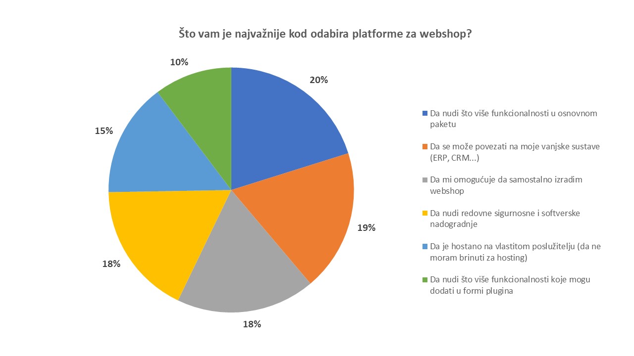 Ispitanicima koji još nemaju webshop, uz broj funkcionalnosti u osnovnom paketu, najvažnije je da platforma nudi redovne sigurnosne i softverske nadogradnje (20 %). Obje skupine na treće mjesto stavljaju povezivanje s vanjskim sustavima (npr ERP), a zanimljivo, oni koji nemaju webshop najmanje cijene da ecommerce rješenje nudi što više funkcionalnosti koje se mogu dodati u formi pluginova.