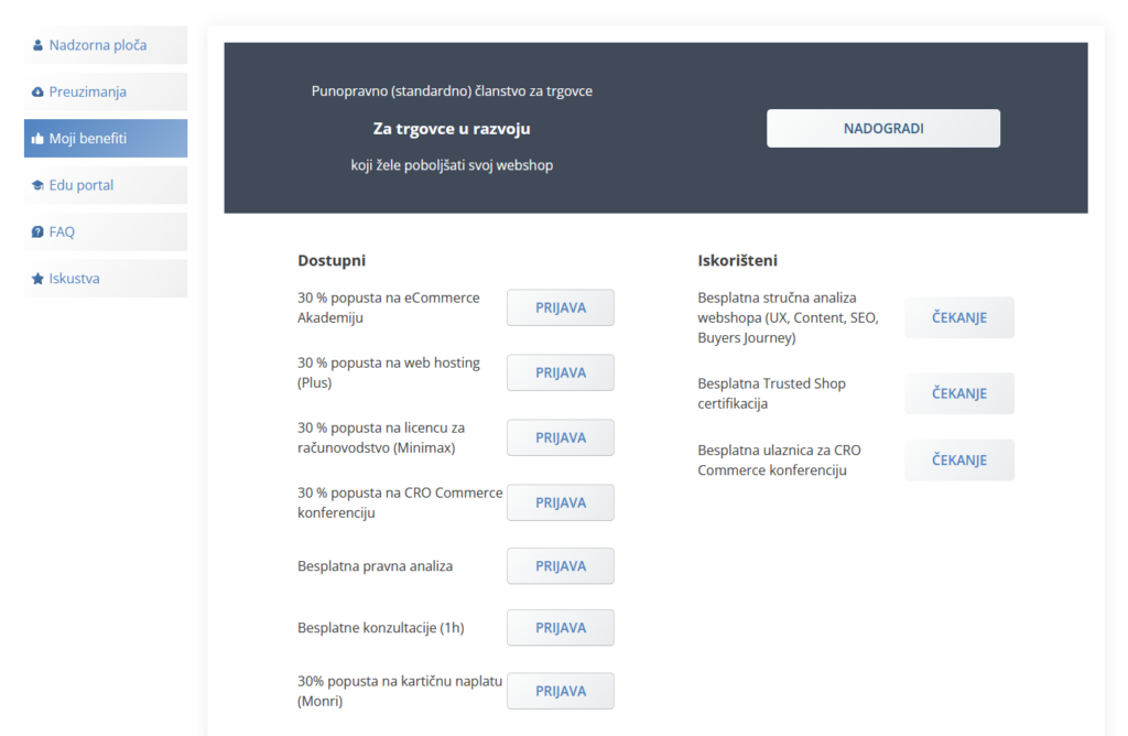 1. Vaši benefiti se sada nalaze u korisničkom profilu. Svi stari i novi članovi po novom imaju pristup korisničkom sučelju, putem kojeg u svakom trenutku imate prikaz svih dostupnih i iskorištenih benefita. Pristup korisničkom sučelju novi članovi ostvaruju registracijom na stranici Udruge, dok se postojeći članovi (web trgovci) mogu prijaviti za pristup na ovom linku.