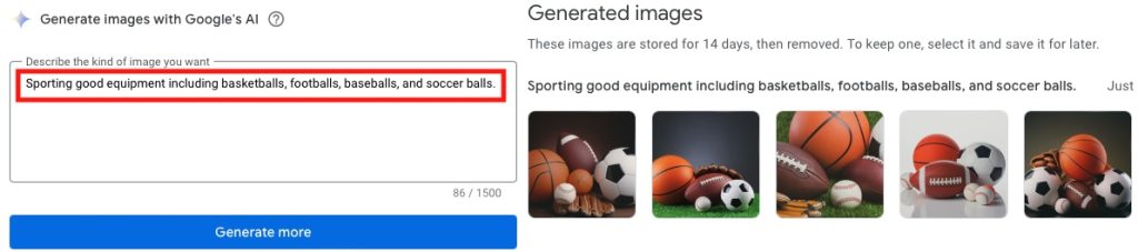 Generator slika koji pokreće umjetna inteligencija pomaže Performans Max kampanjama. Iz opisa oglasa Google može stvoriti relevantne slike. U donjem primjeru, AI generator proizveo je slike sportske opreme na temelju opisa.